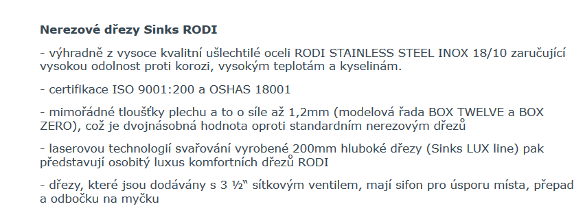 • Samozřejmostí u všech dřezů Rodi je použití prvotřídní chromniklové nerezové oceli CrNi 18/10 (AISI 304).
